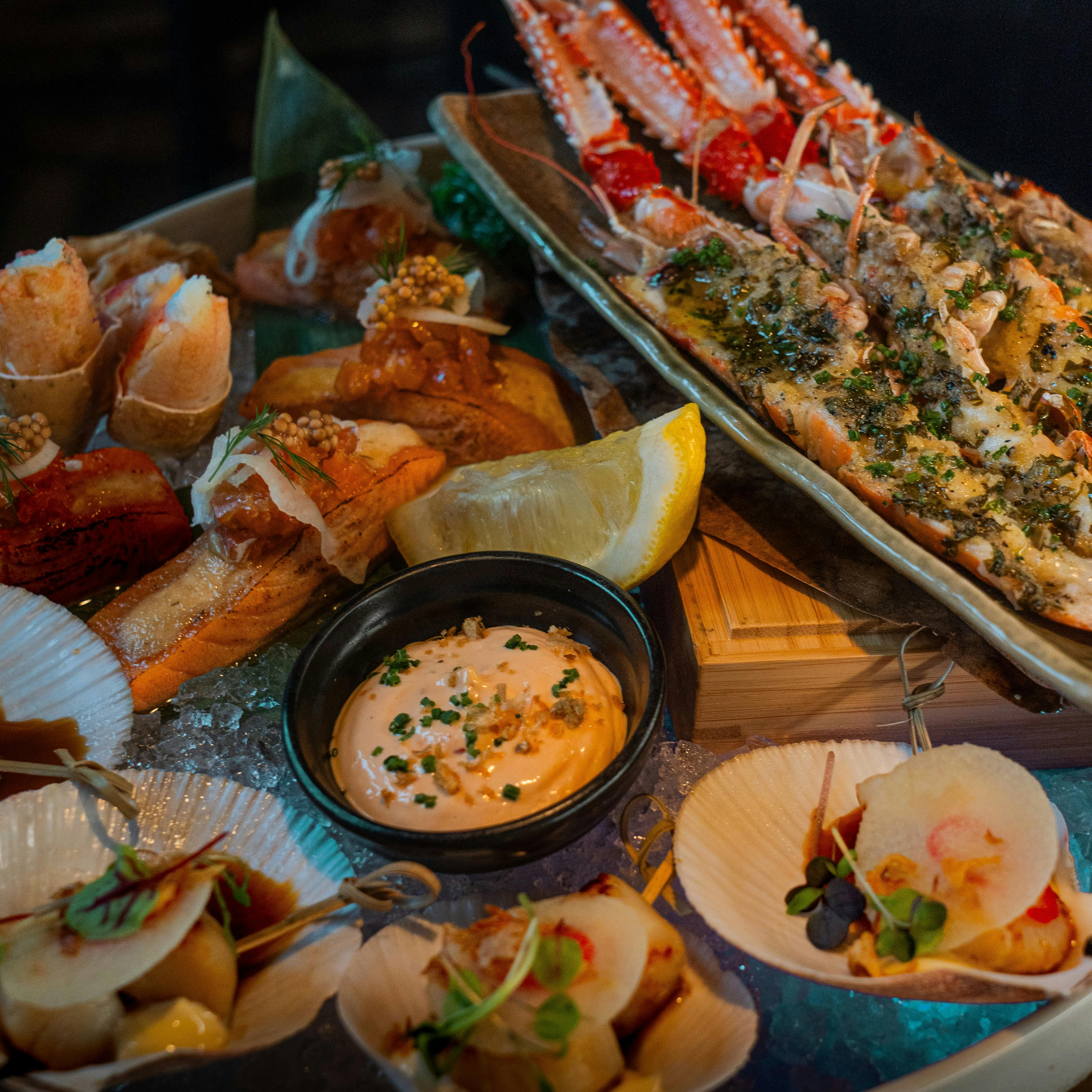 Létt reykt bleikja, íslensk hörpuskel, snjókrabba klær, humar thermidore